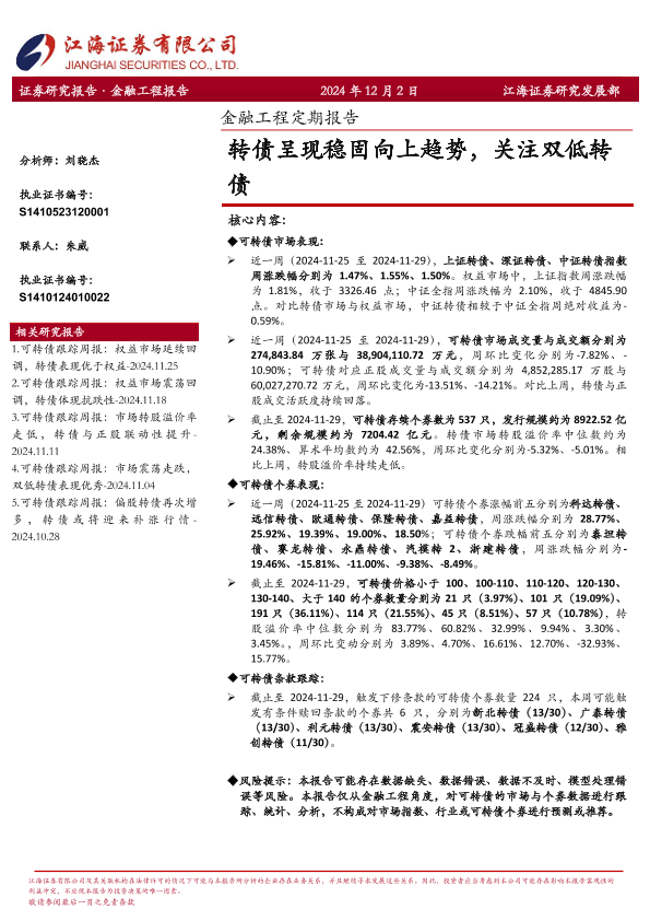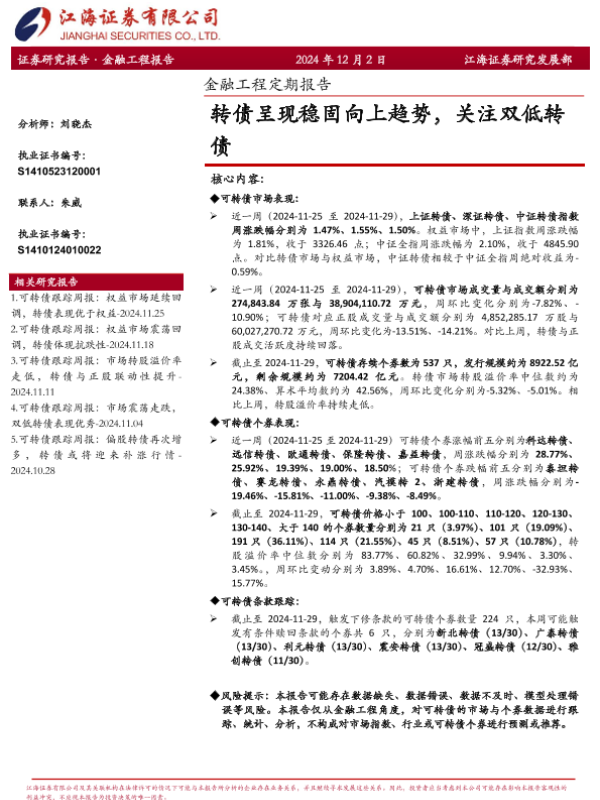 【江海证券】【20241202】金融工程定期报告:转债呈现稳固向上趋势,关注双低转债-12页
