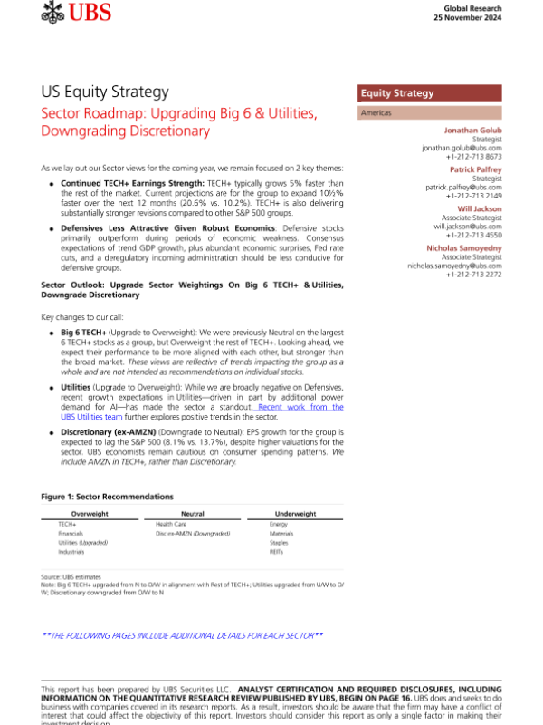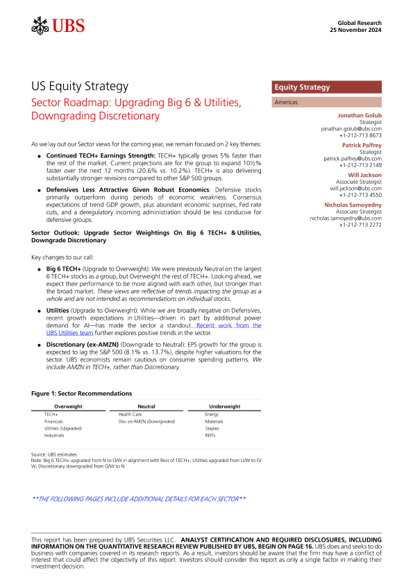 【UBS】【20241125】US Equity Strategy _Sector Roadmap Upgrading Big 6 & Utilities, Downgrading Discretionary-20页