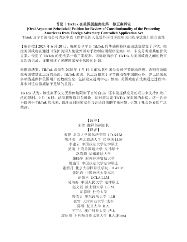【TikTok Inc.和 ByteDance Ltd.】【20240620】Tiktok及字节跳动公司请求审查《保护美国人免受外国对手控制应用程序侵害法案》的合宪性-59页