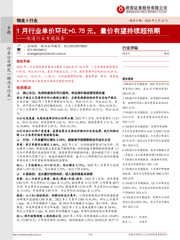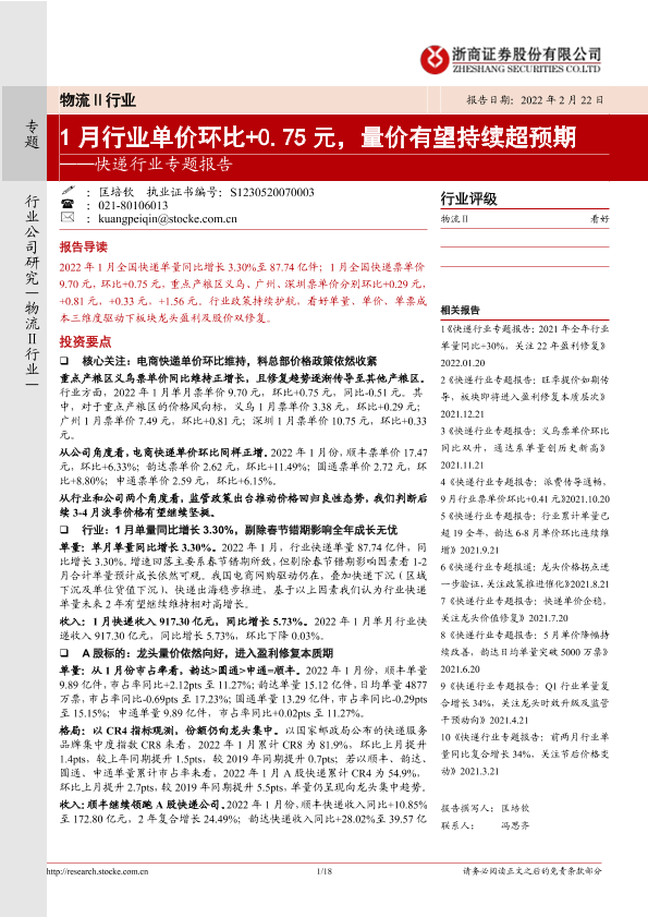 【浙商证券】【20220222】快递行业专题报告:1月行业单价环比+0.75元,量价有望持续超预期-18页