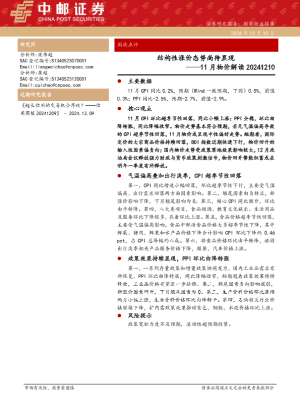 【中邮证券】【20241210】11月物价解读:结构性涨价态势尚待显现-13页