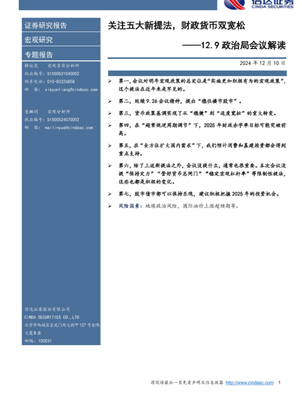 【信达证券】【20241210】12.9政治局会议解读:关注五大新提法,财政货币双宽松-10页