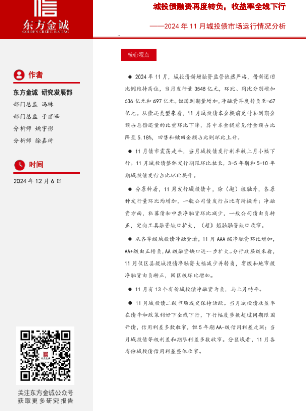 【东方金诚】【20241206】2024年11月城投债市场运行情况分析:城投债融资再度转负,收益率全线下行-25页