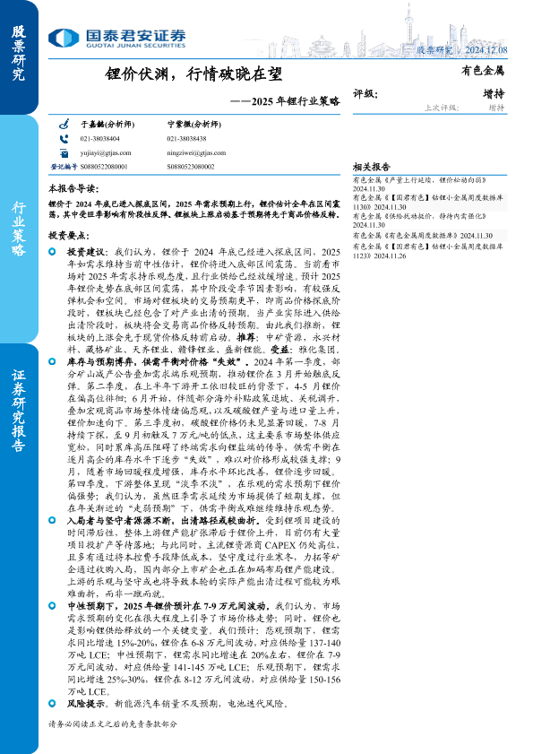 【国泰君安证券】【20241208】2025年锂行业策略:锂价伏渊,行情破晓在望-30页
