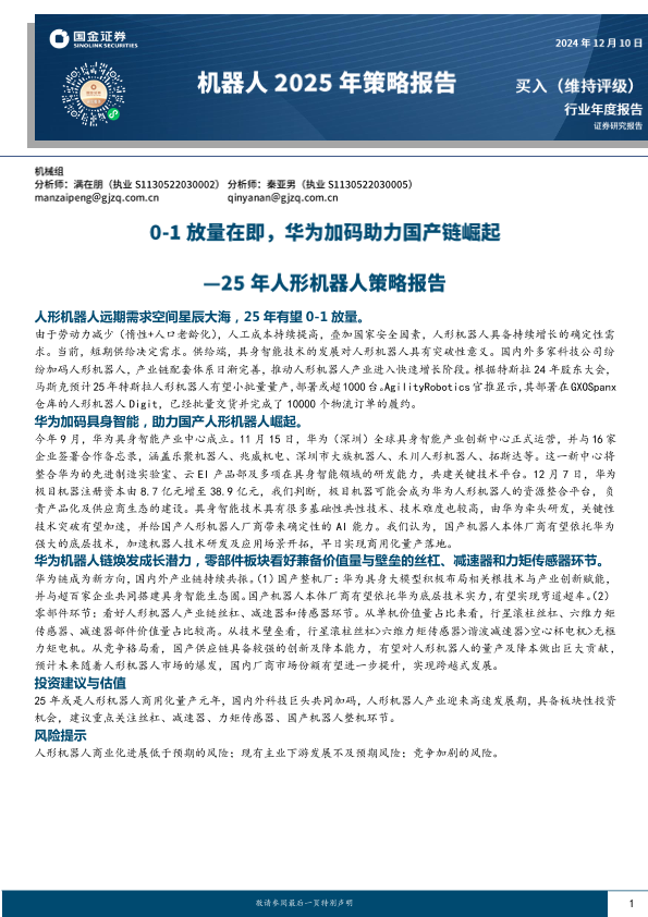 【国金证券】【20241210】25年人形机器人行业策略报告:0-1放量在即,华为加码助力国产链崛起-20页