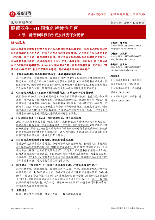 【浙商证券】【20241211】A股、港股和国债的宏观友好度评分更新:股债双牛+AH同涨的持续性几何-18页