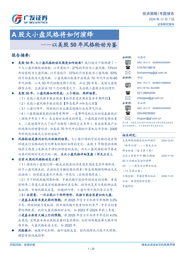 【广发证券】【20241207】A股大小盘风格将如何演绎:以美股50年风格轮动为鉴-23页
