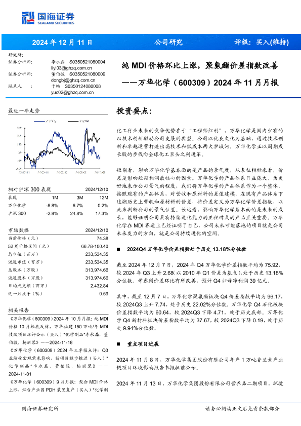 【国海证券】【20241211】万华化学(600309)2024年11月月报:纯MDI价格环比上涨,聚氨酯价差指数改善-34页