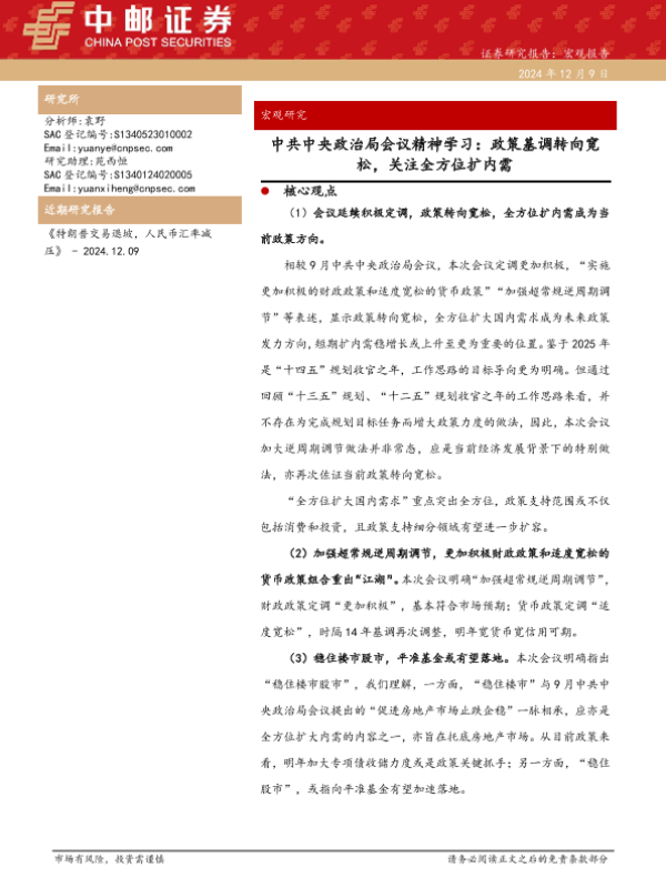 【中邮证券】【20241209】中共中央政治局会议精神学习:政策基调转向宽松,关注全方位扩内需-10页