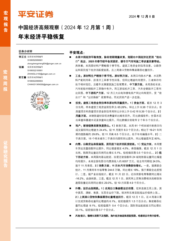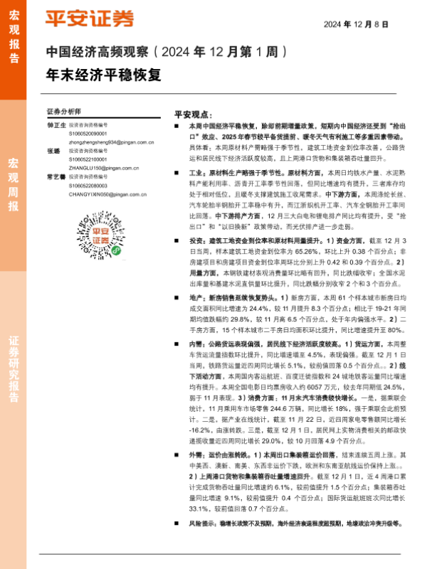 【平安证券】【20241208】中国经济高频观察(2024年12月第1周):年末经济平稳恢复-12页
