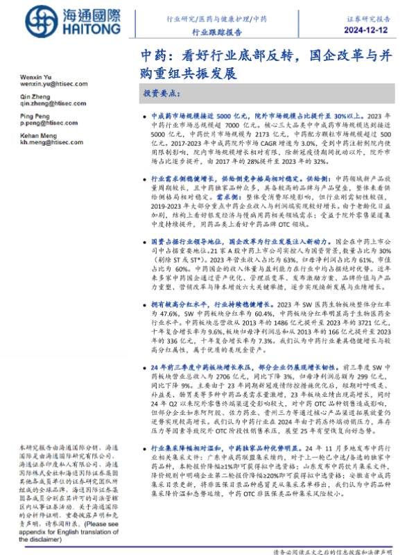【海通国际】【20241212】中药行业:看好行业底部反转,国企改革与并购重组共振发展-13页