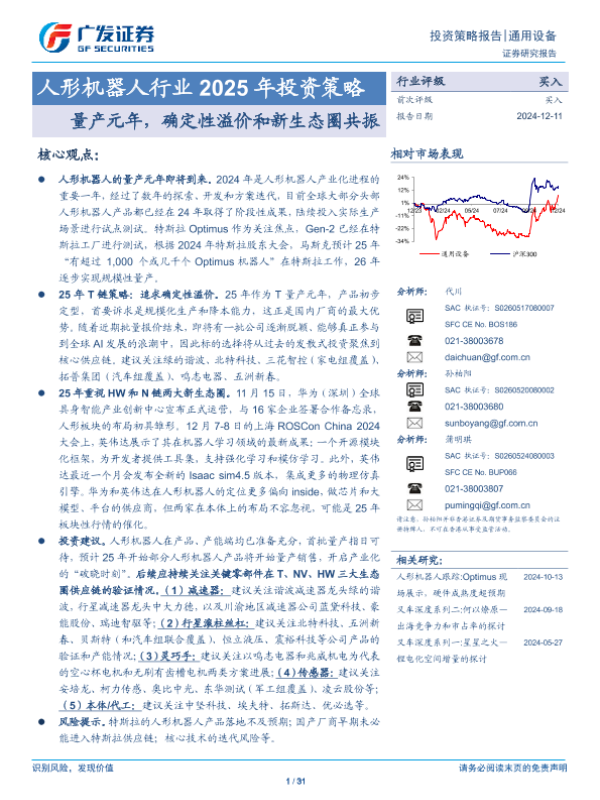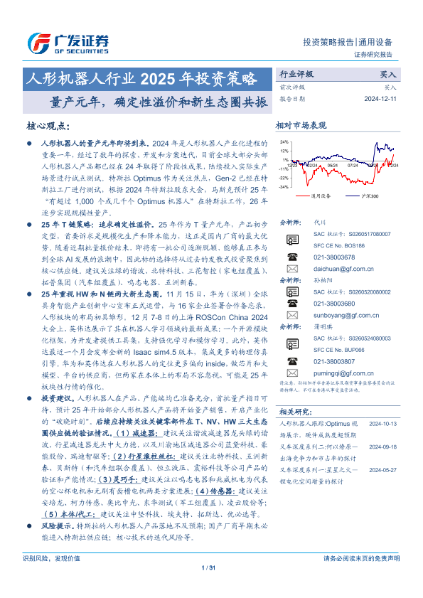 【广发证券】【20241211】人形机器人行业2025年投资策略:量产元年,确定性溢价和新生态圈共振-31页