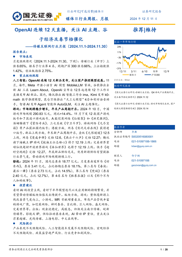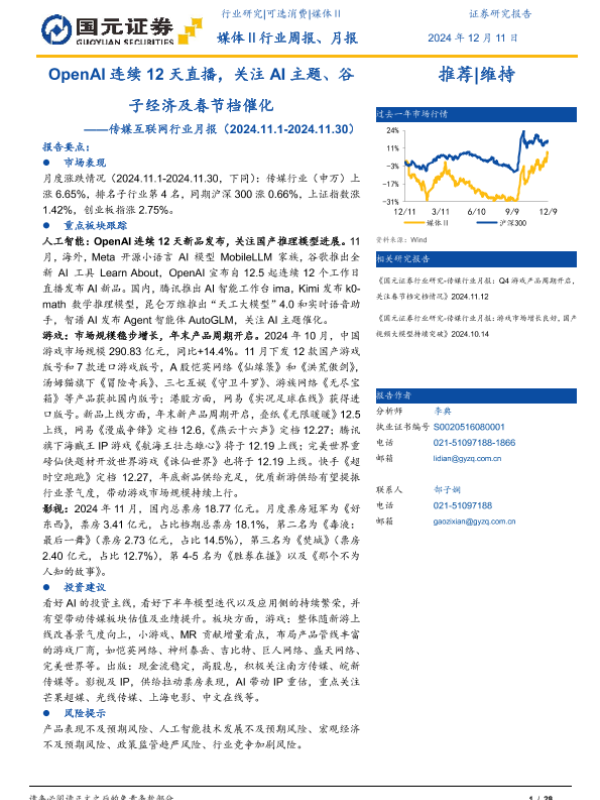 【国元证券】【20241211】传媒互联网行业月报:OpenAI连续12天直播,关注AI主题、谷子经济及春节档催化-28页