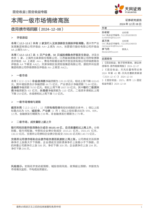 【天风证券】【20241208】信用债市场回顾:本周一级市场情绪高涨-19页