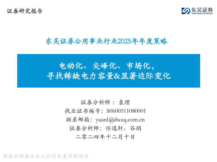 【东吴证券】【20241210】公用事业行业2025年年度策略:电动化、尖峰化、市场化,寻找稀缺电力容量&显著边际变化-76页