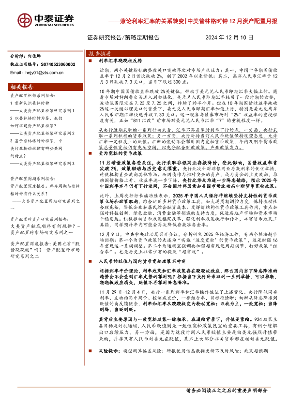 【中泰证券】【20241210】兼论利率汇率的关系转变|中美普林格时钟12月资产配置月报-30页