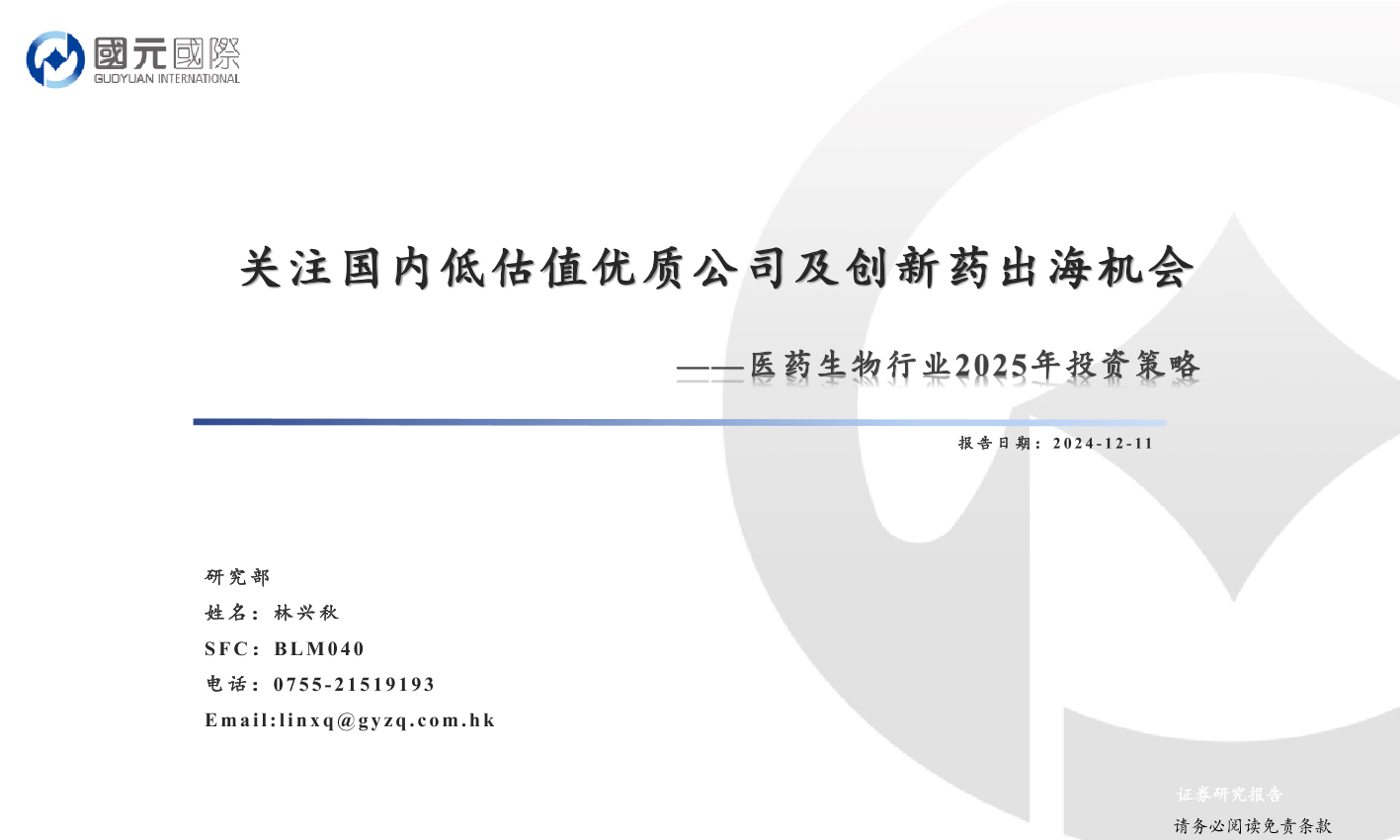 【国元国际】【20241211】医药生物行业2025年投资策略:关注国内低估值优质公司及创新药出海机会-31页
