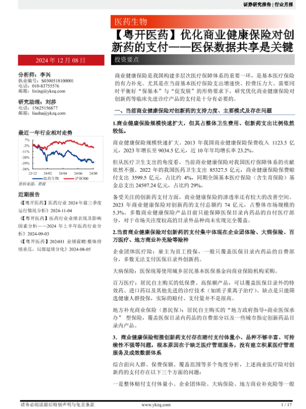 【粤开证券】【20241208】优化商业健康保险对创新药的支付——医保数据共享是关键-17页