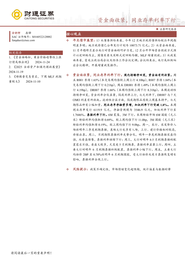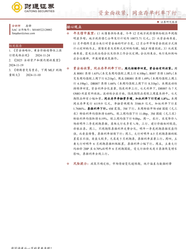 【财通证券】【20241208】固收定期报告:资金面收紧,同业存单利率下行-19页