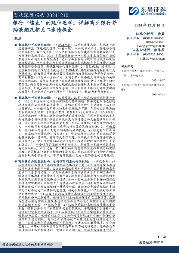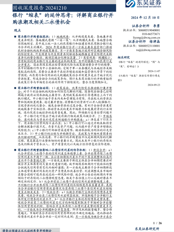 【东吴证券】【20241210】固收深度报告:银行“缩表”的延伸思考,详解商业银行并购浪潮及相关二永债机会-26页