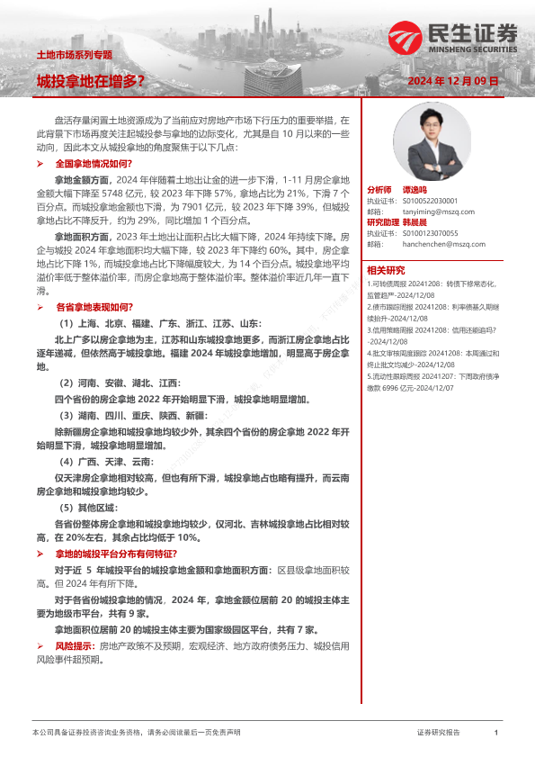 【民生证券】【20241209】土地市场系列专题:城投拿地在增多?-26页
