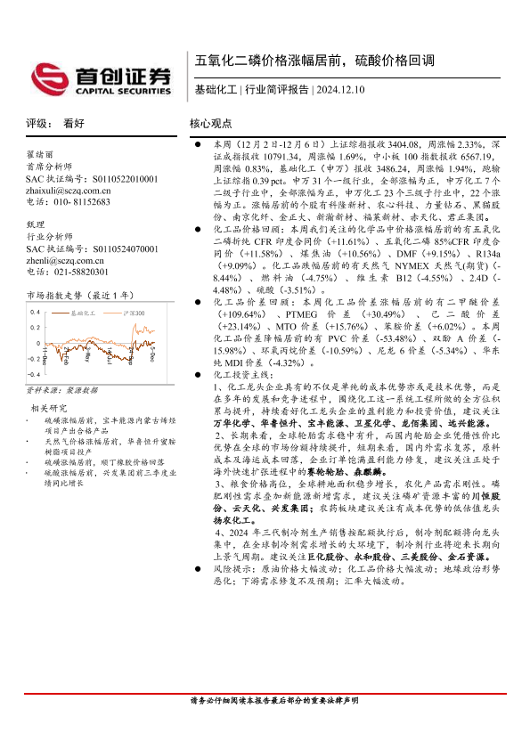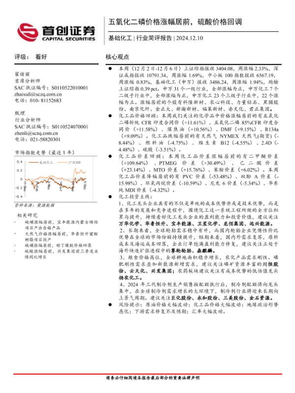 【首创证券】【20241210】基础化工行业简评报告:五氧化二磷价格涨幅居前,硫酸价格回调-15页