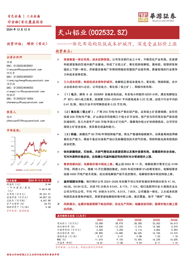 【华源证券】【20241212】天山铝业(002532)一体化布局构筑低成本护城河,深度受益铝价上涨-15页