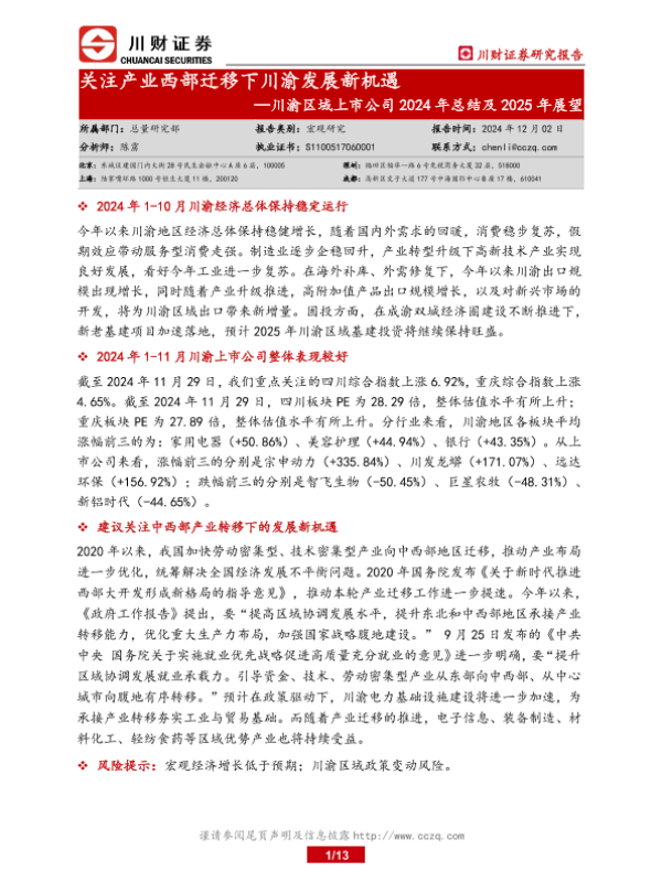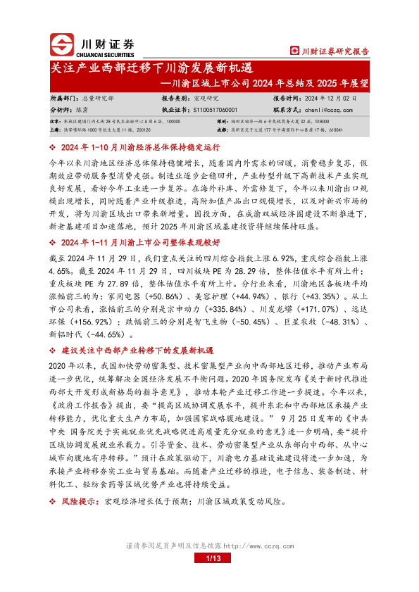 【川财证券】【20241202】川渝区域上市公司2024年总结及2025年展望:关注产业西部迁移下川渝发展新机遇-13页
