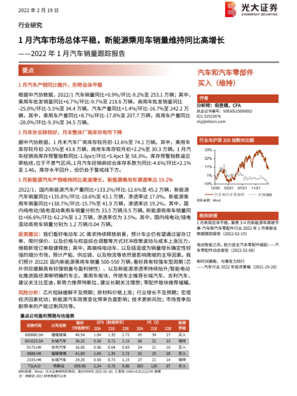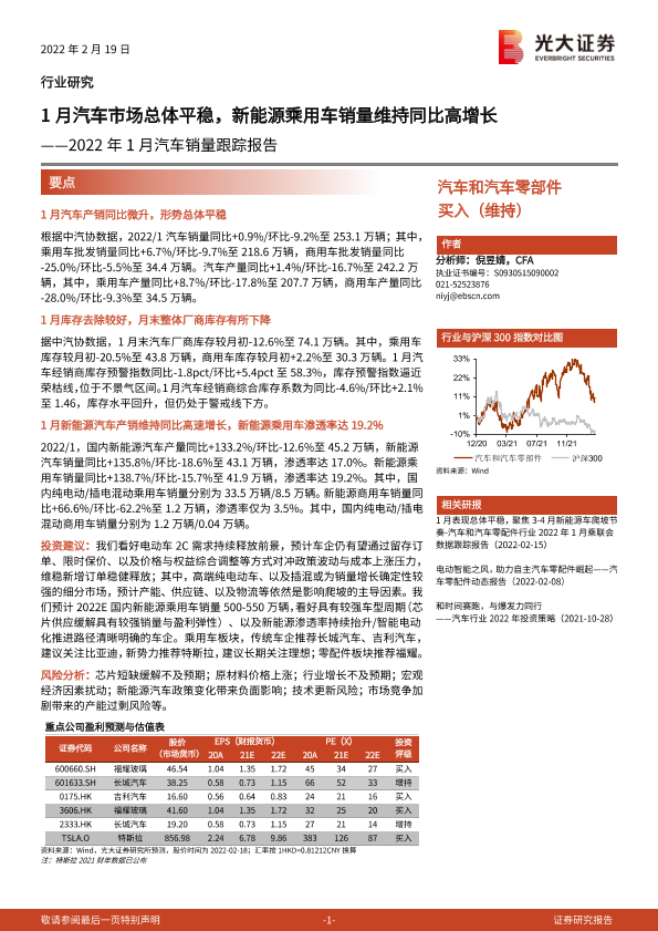 【光大证券】【20220219】汽车和汽车零部件行业2022年1月汽车销量跟踪报告:1月汽车市场总体平稳,新能源乘用车销量维持同比高增长-15页
