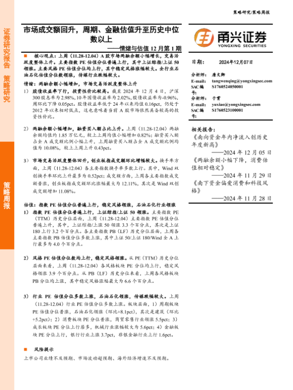 【甬兴证券】【20241207】情绪与估值12月第1期:市场成交额回升,周期、金融估值升至历史中位数以上-10页