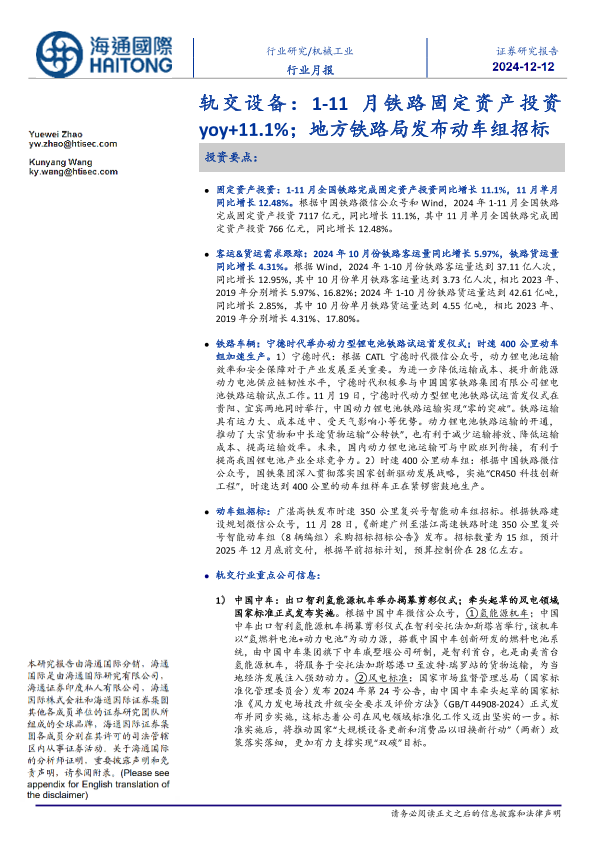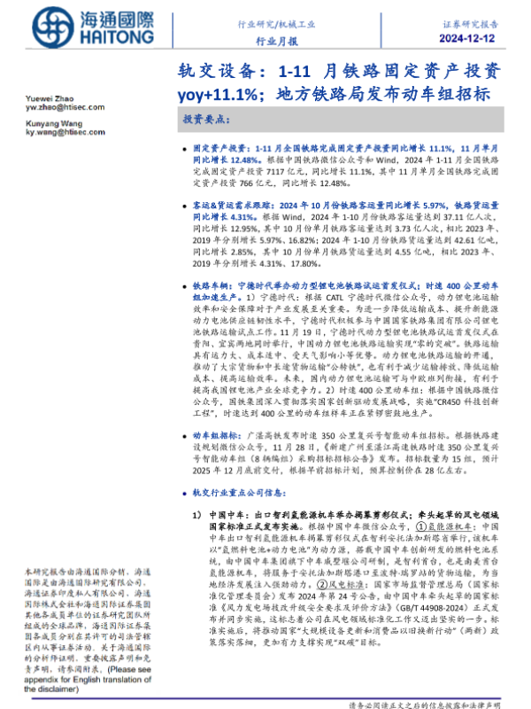 【海通国际】【202412】机械工业行业轨交设备:1-11月铁路固定资产投资yoy+11.1%;地方铁路局发布动车组招标-12页