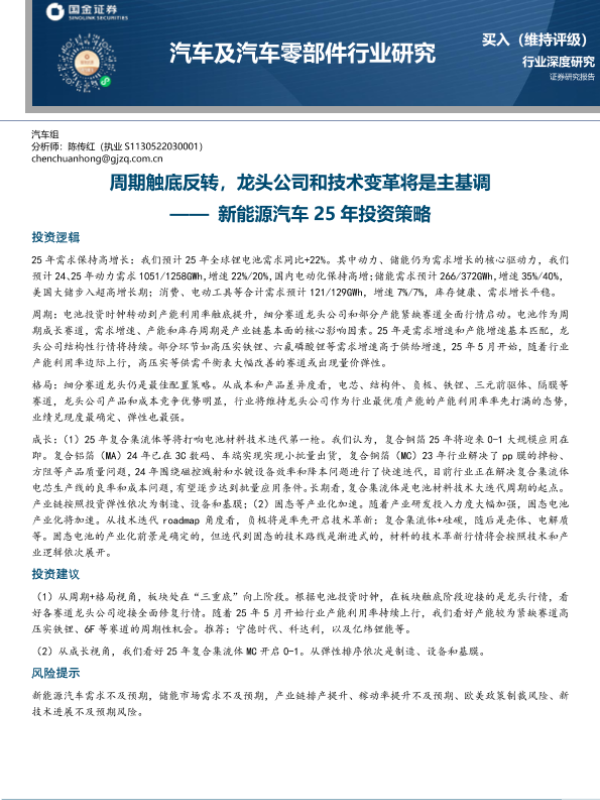 【国金证券】【20241207】汽车及汽车零部件行业研究-新能源汽车25年投资策略:周期触底反转,龙头公司和技术变革将是主基调-37页