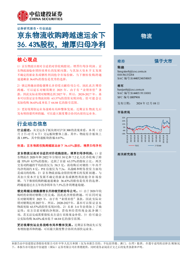 【中信建投证券】【20241208】物流行业:京东物流收购跨越速运余下36.43%股权,增厚归母净利-20页
