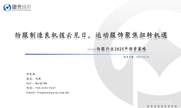 【国元国际】【20241211】纺服行业2025年投资策略:纺服制造良机拨云见日,运动服饰聚焦扭转机遇-25页