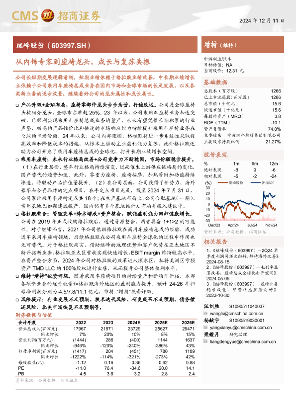 【海通证券】【20241211】继峰股份(603997)从内饰专家到座椅龙头,成长与复苏共振-23页