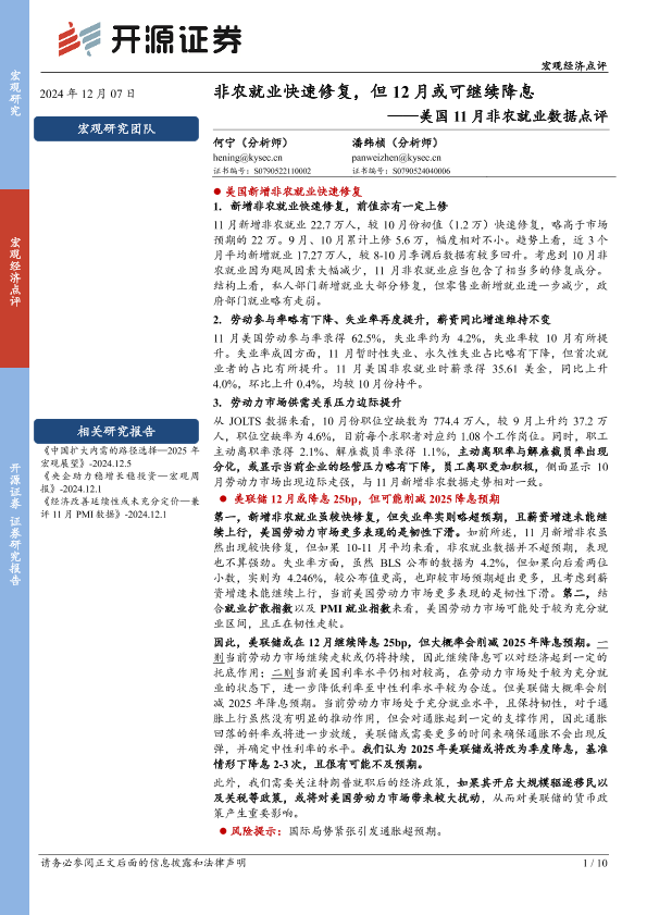 【开源证券】【20241207】美国11月非农就业数据点评:非农就业快速修复,但12月或可继续降息-10页