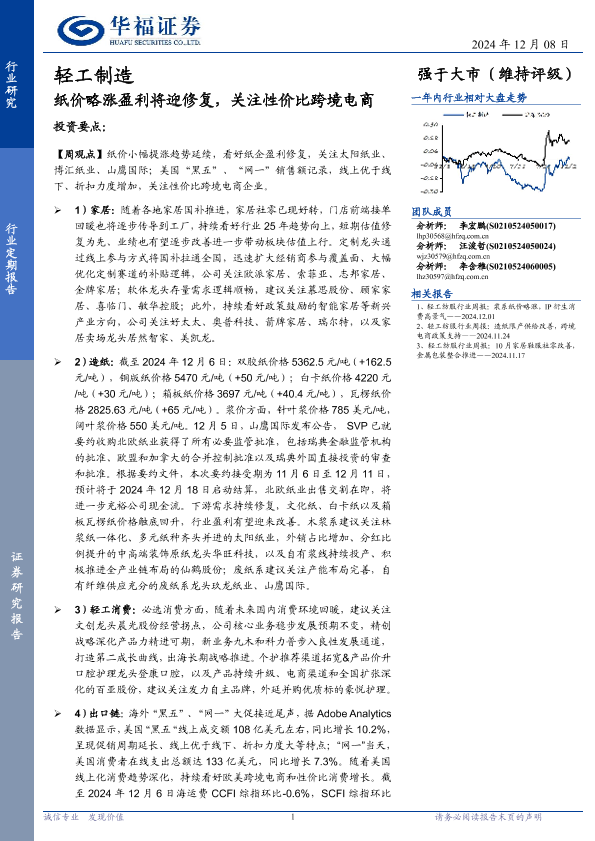 【华福证券】【20241208】轻工制造行业定期报告:纸价略涨盈利将迎修复,关注性价比跨境电商-20页