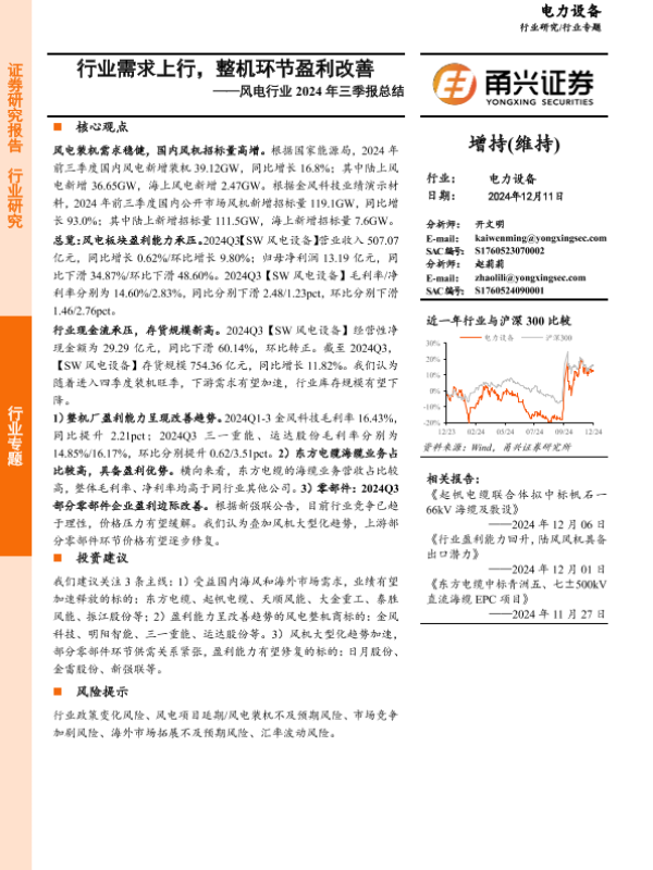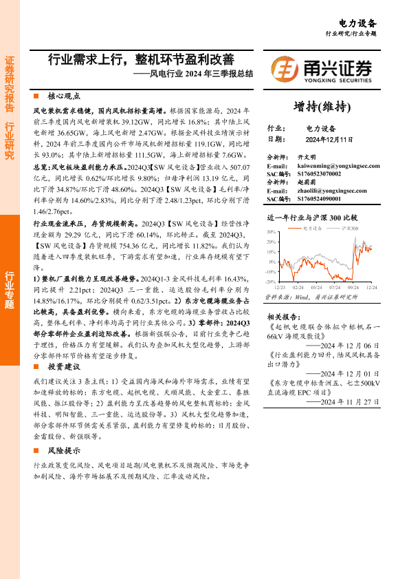 【甬兴证券】【20241211】风电行业2024年三季报总结:行业需求上行,整机环节盈利改善-14页