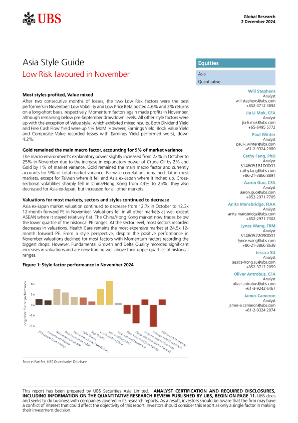 【UBS Securities Asia Limited】【20241202】Equities-Asia Style Guide Low Risk favoured in November-15页