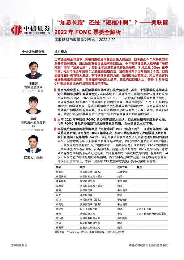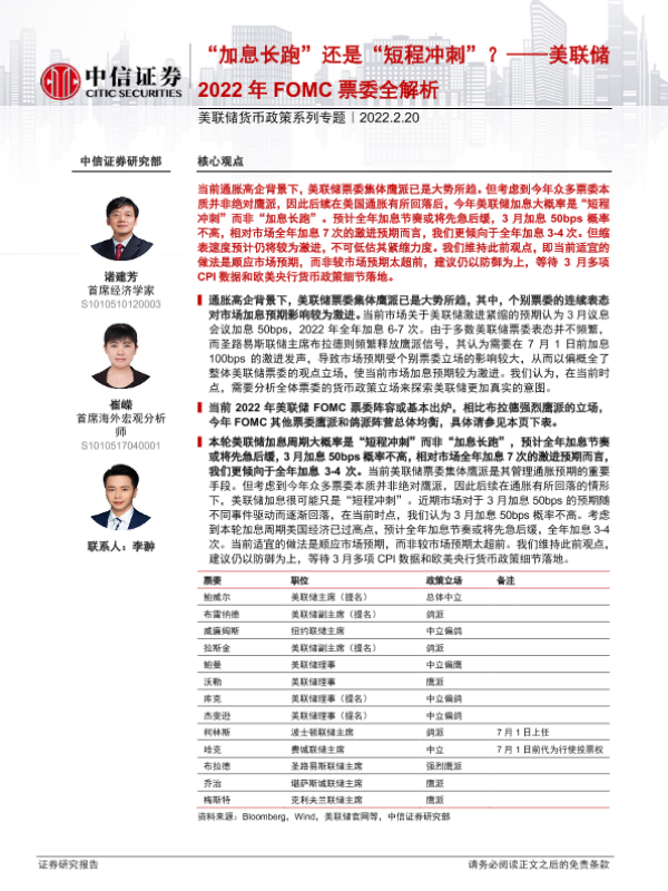 【中信证券】【20220220】美联储货币政策系列专题:美联储2022年FOMC票委全解析,“加息长跑”还是“短程冲刺”?-15页