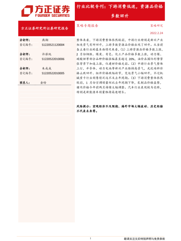【方正证券】【20220224】行业比较专刊:下游消费低迷,资源品价格多数回升-15页