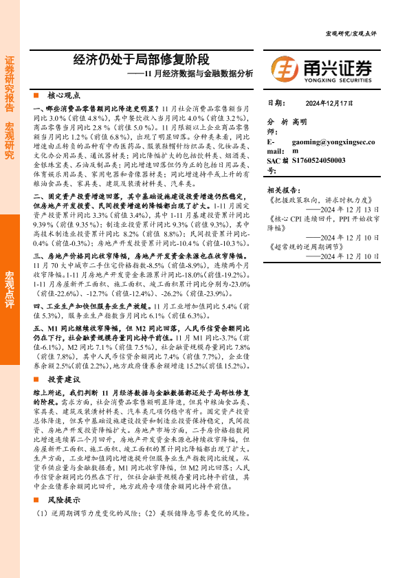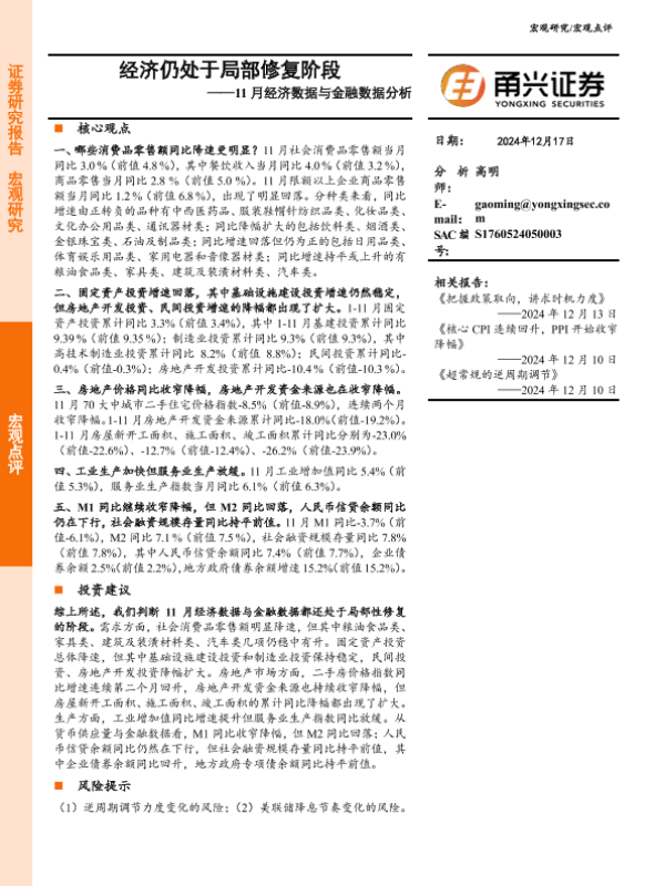 【甬兴证券】【20241217】11月经济数据与金融数据分析:经济仍处于局部修复阶段-10页