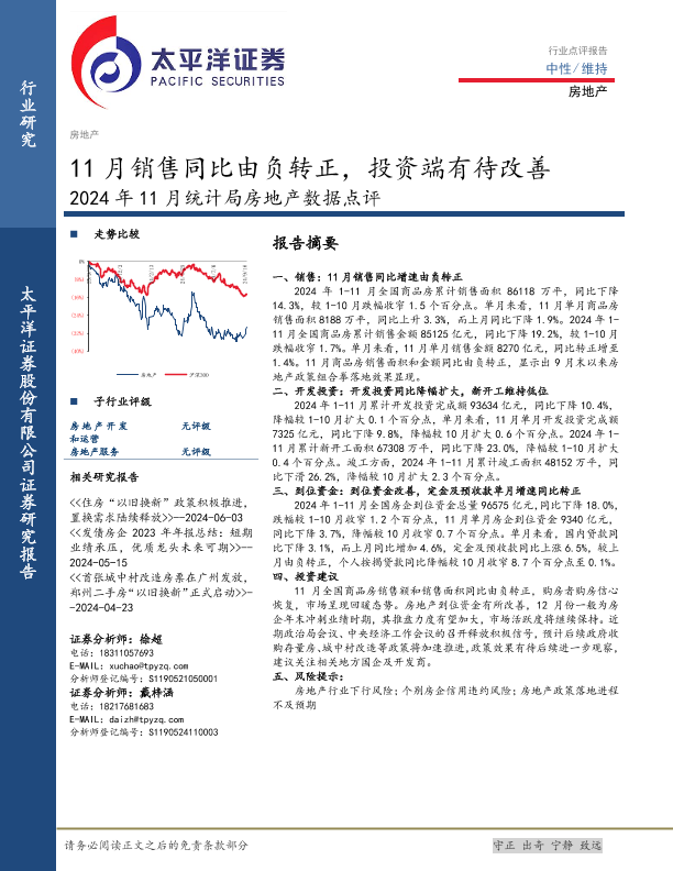 【太平洋证券】【20241217】2024年11月统计局房地产行业数据点评:11月销售同比由负转正,投资端有待改善-11页