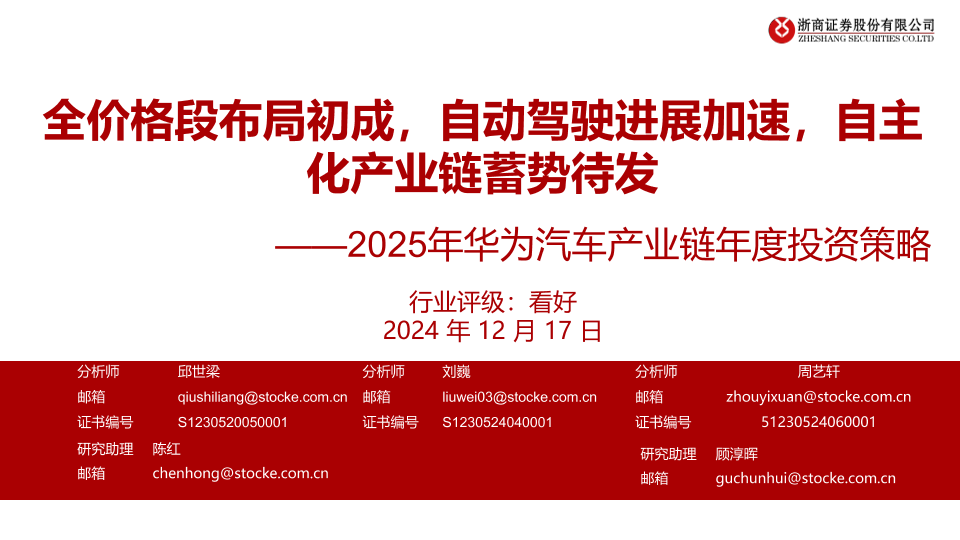 【浙商证券】【20241217】2025年华为汽车产业链行业年度投资策略:全价格段布局初成,自动驾驶进展加速,自主化产业链蓄势待发-43页