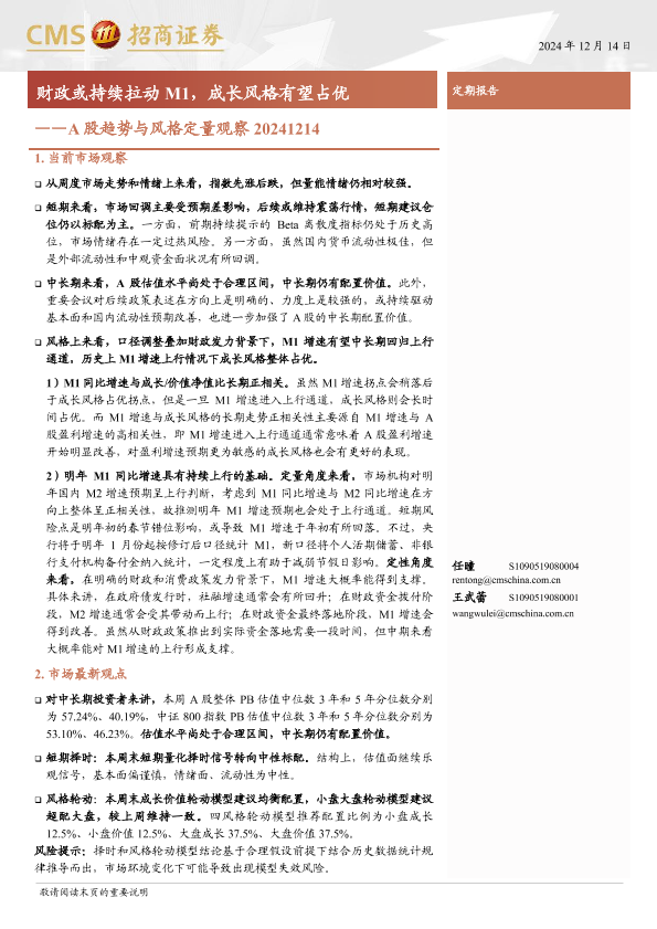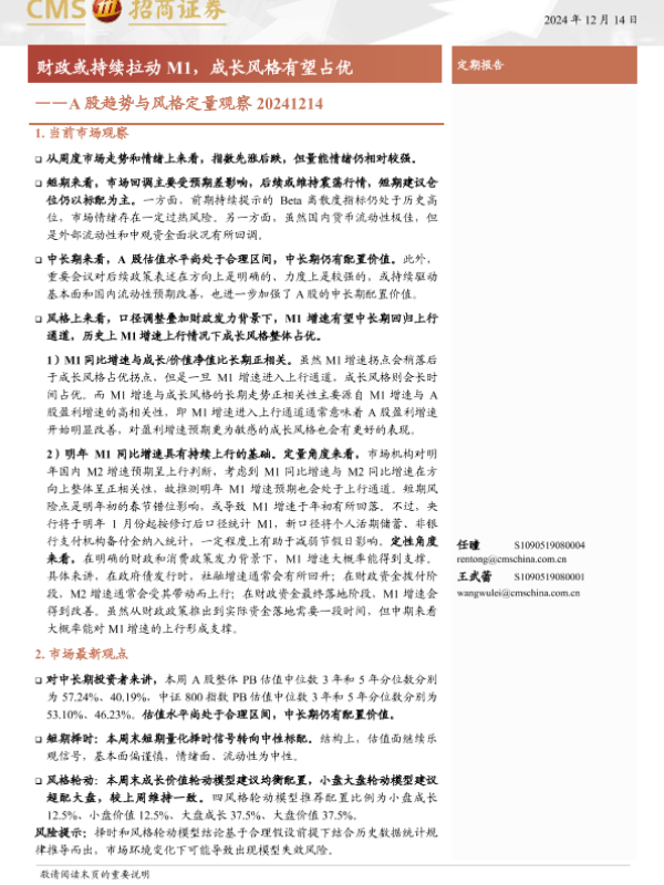 【海通证券】【20241214】A股趋势与风格定量观察:财政或持续拉动M1,成长风格有望占优-13页