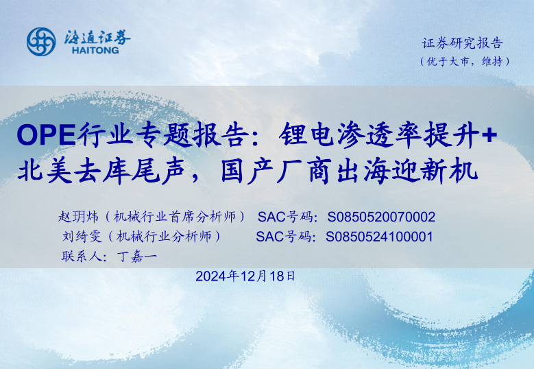【海通证券】【20241218】OPE行业专题报告:锂电渗透率提升+北美去库尾声,国产厂商出海迎新机-30页