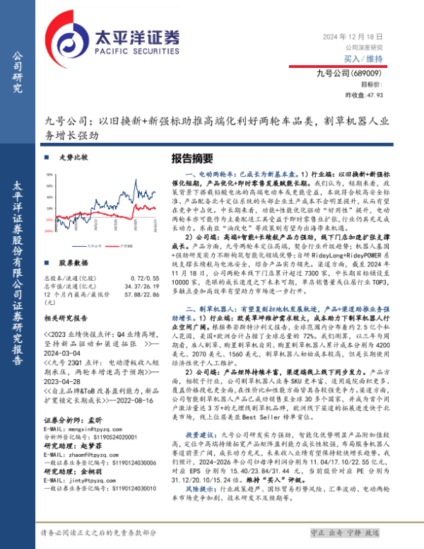 【太平洋证券】【20241218】九号公司(689009)以旧换新+新强标助推高端化利好两轮车品类,割草机器人业务增长强劲-50页