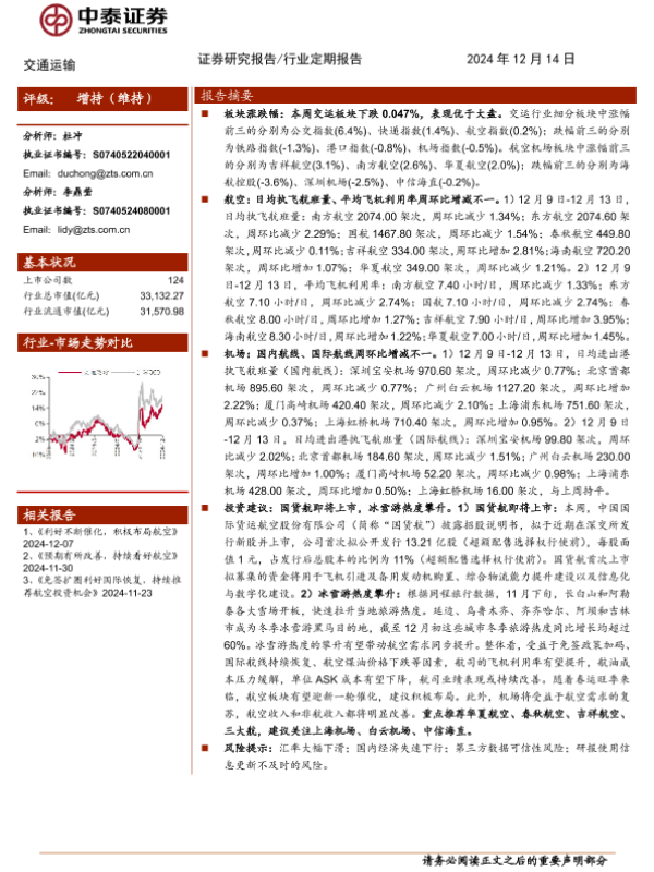 【中泰证券】【20241214】交通运输行业:国货航即将上市,冰雪游热度攀升-23页