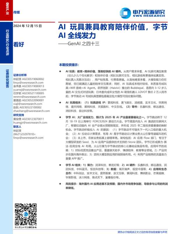 【申万宏源】【20241215】传媒行业GenAI之四十三:AI玩具兼具教育陪伴价值,字节AI全线发力-10页