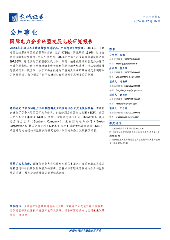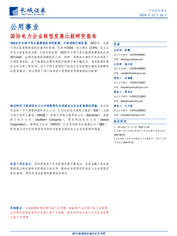 【长城证券】【20241216】公用事业行业:国际电力企业转型发展比较研究报告-80页